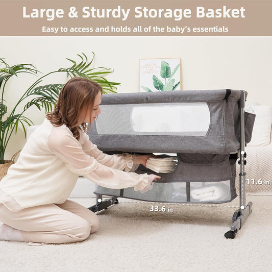 3 in 1 Baby Bassinet Bedside Sleeper,Bedside Bassinet for Baby,4 Height Adjustable Bedside Crib with Storage Basket & Mosquito Net,Easy Folding Bassinet for Newborn/Infant,Safe Portable Baby Bed