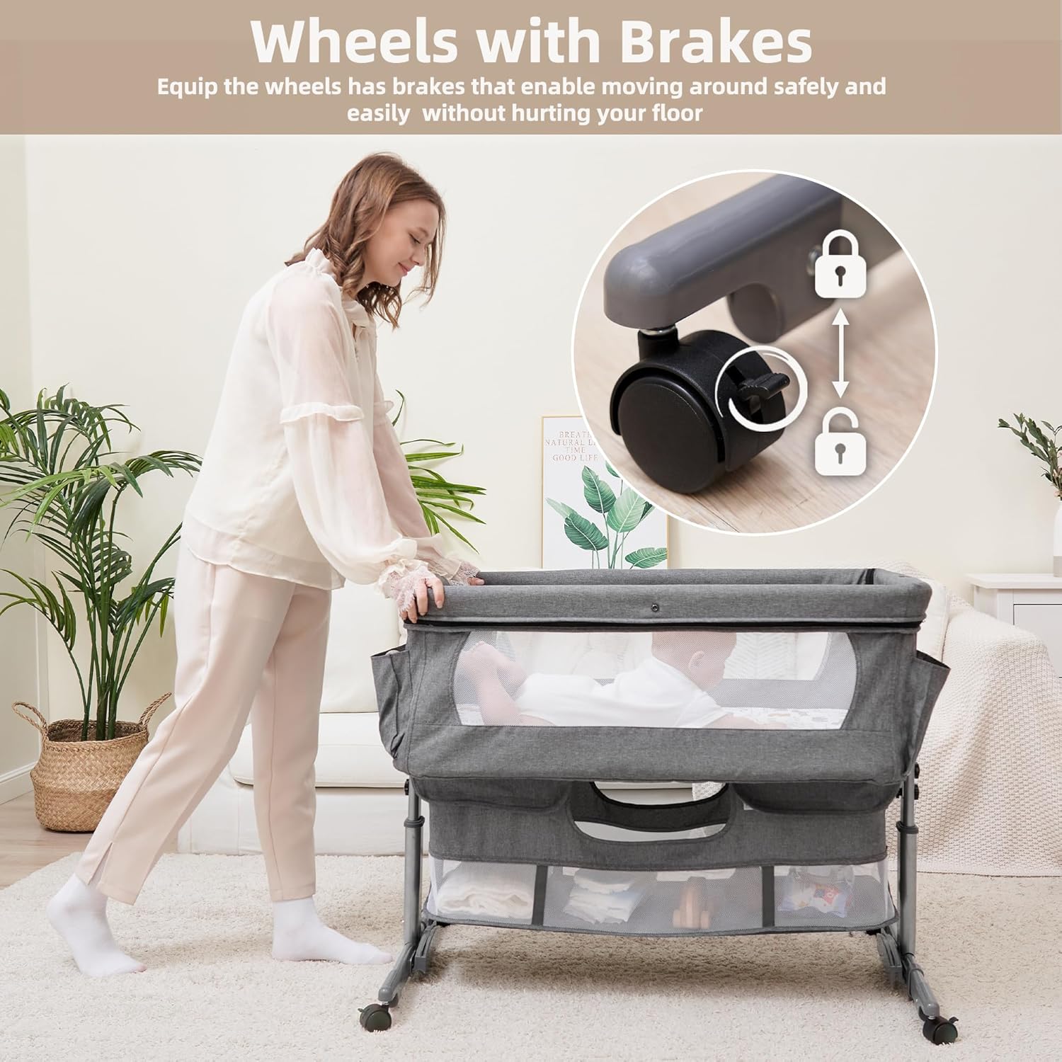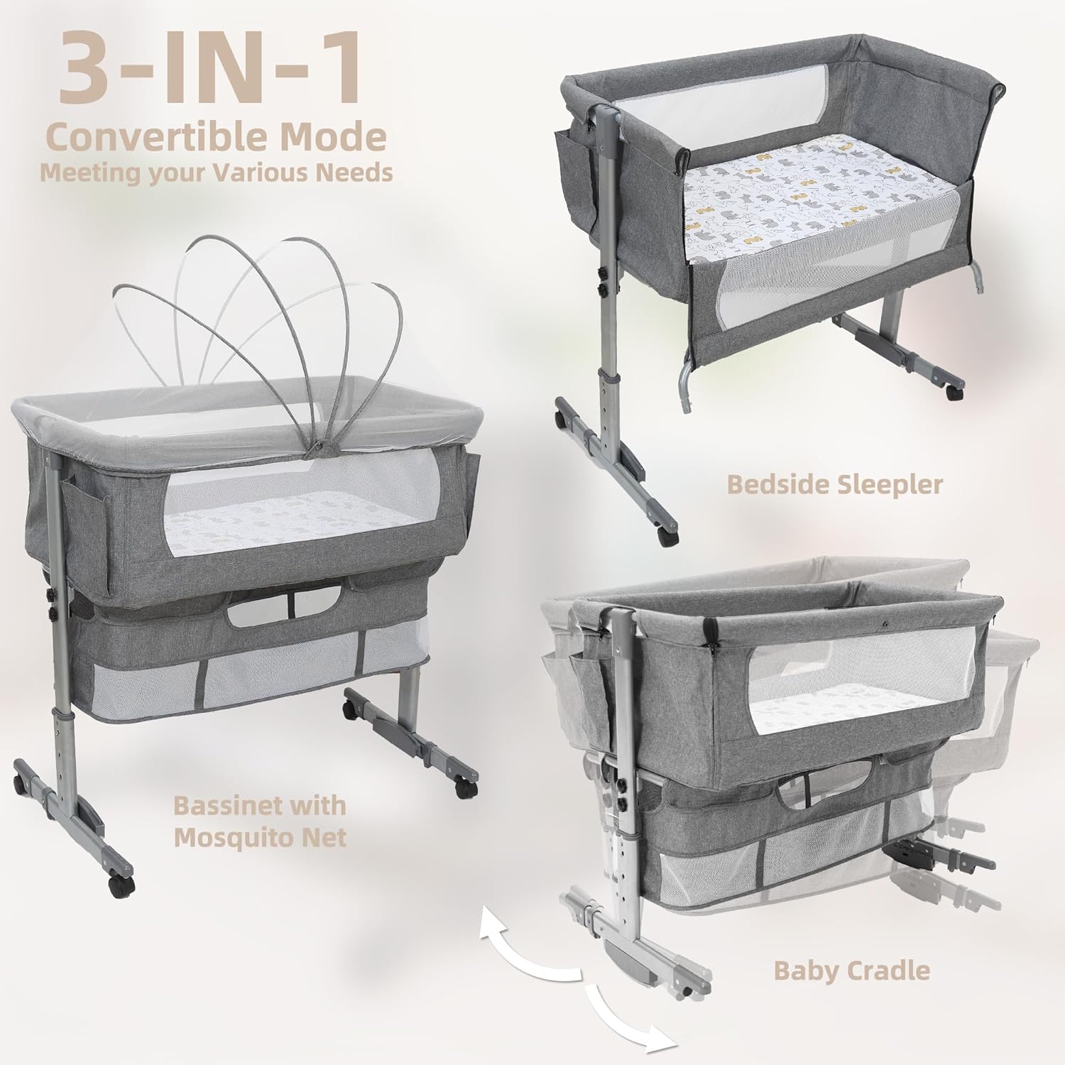 3 in 1 Baby Bassinet Bedside Sleeper,Bedside Bassinet for Baby,4 Height Adjustable Bedside Crib with Storage Basket & Mosquito Net,Easy Folding Bassinet for Newborn/Infant,Safe Portable Baby Bed