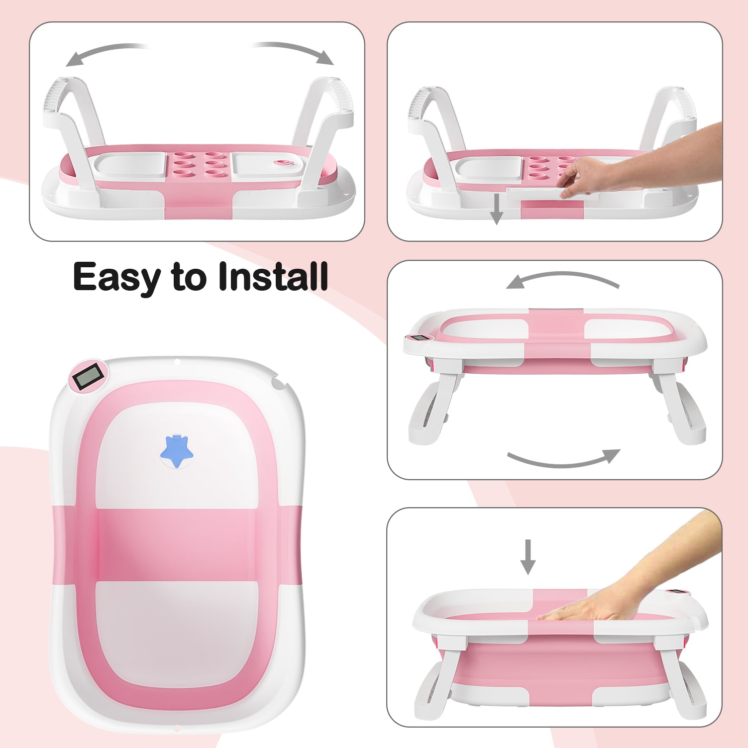Aprpink Foldable Baby PP+TPE Bathtub with Soft Cushion&Thermometer for 0-36 Months Toddler Gray/Pink/Blue/Green/Dark Pink/Turquoise/Light Blue